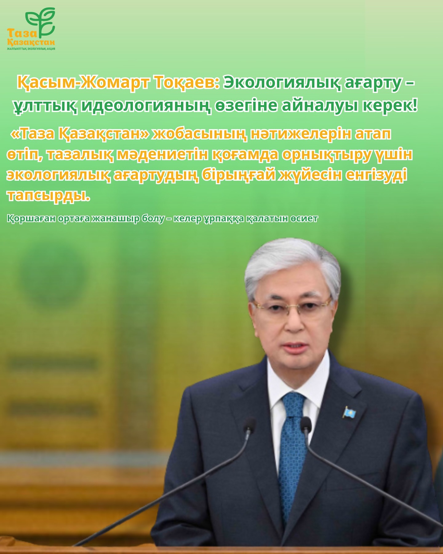 Тазалық мәдениетін қоғамда терең орнықтыру – өте маңызды міндет. Осы бағытта Үкімет экологиялық ағарту ісінің бірыңғай үлгісін енгізуге тиіс. Бұл жұмыс мектептен бастап жоғары оқу орындарына дейін барлық деңгейдегі білім мекемелерін қамтуы қажет».